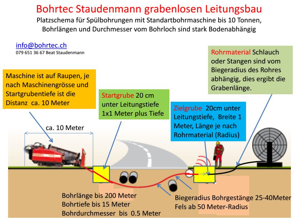 Erst ab einer Längsneigung von 4 % kann man ein Gegengefälle in der Leitung ausschließen. Da wir fast alle grabenlosen Bohrverfahren ausführen, können wir diese Tatsache im Gegensatz zu manch anderen Firmen auch offen und ehrlich ansprechen.