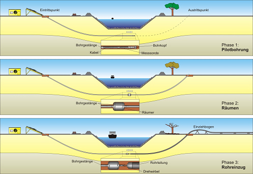 Die grabenlose Verlegung einer Leitung im Spülbohrverfahren gliedert sich in 3 Phasen: